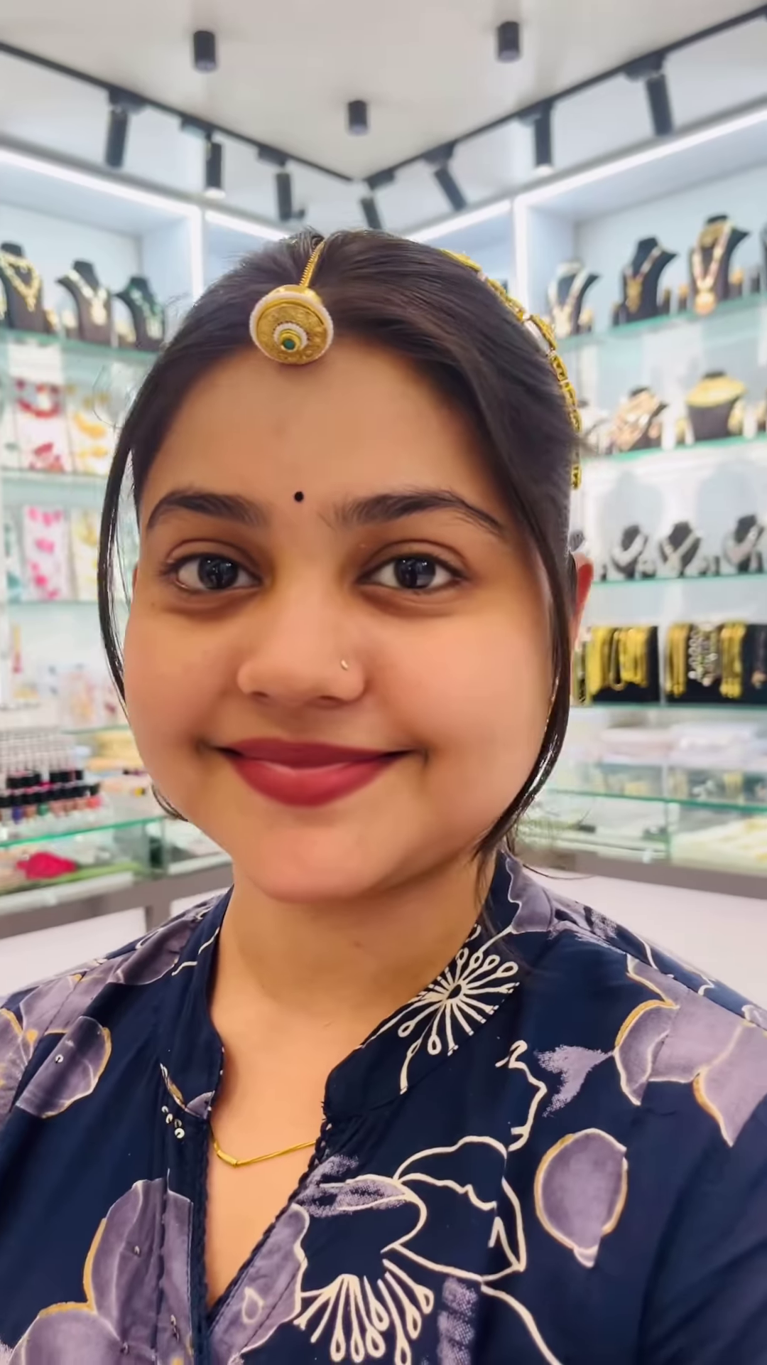 The background suggests a jewelry store or a display area with shelves showcasing various other pieces of jewelry, indicating that this Matha Patti is likely a commercially available item. The bright lighting highlights the intricate details and the subtle shine of the gold, Kundan, and pearls.